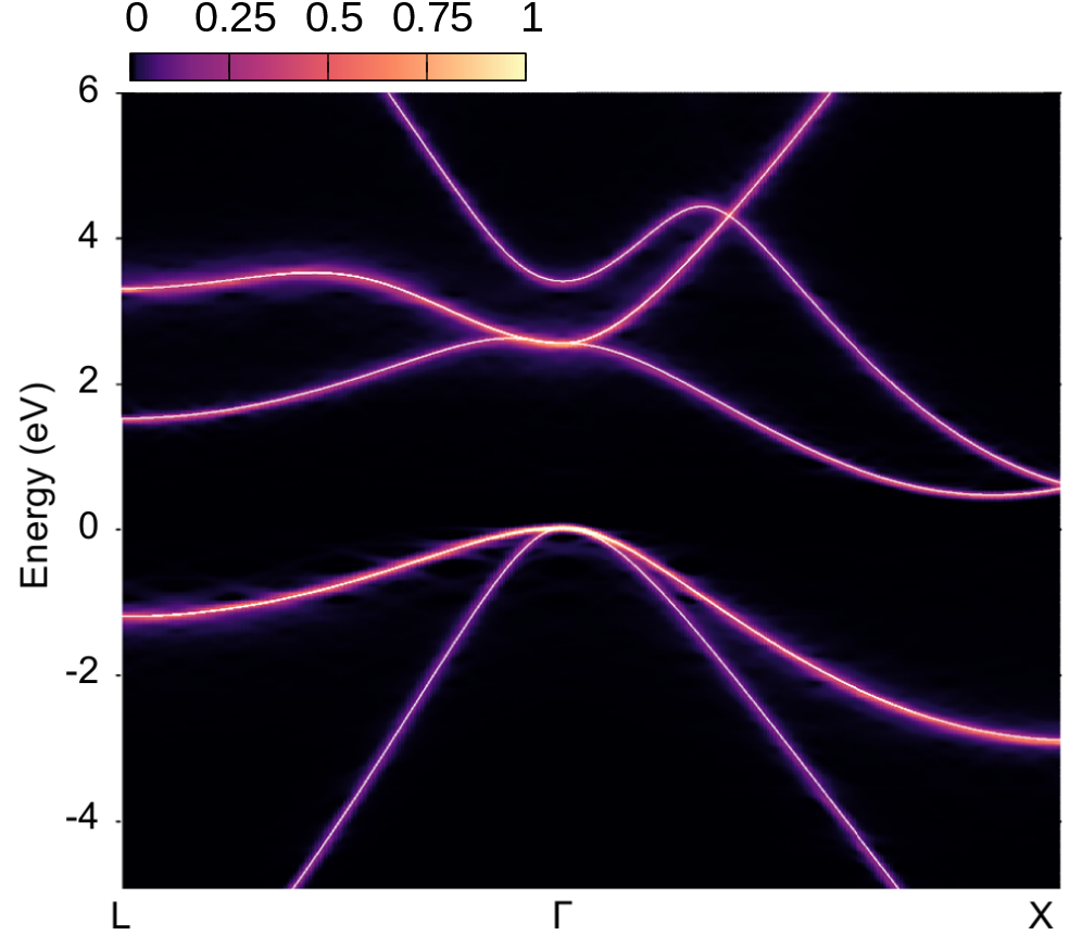 This will generate all_kpts directory and the new files bands01.dat and spectral_weights01.dat, containing the band energies, \(\varepsilon_{m {\bf K}}(T)\), and spectral weights, \(P_{m {\bf K}, {\bf k}} (T)\), for all K-points, respectively. Now you have all the ingredients to evaluate the spectral function as in Exercise 2.